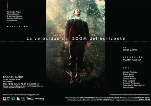 Mezclando la estructura del falso documental, yuxtaposición de escenas y desarrollo de planteamientos éticos a través de diálogos dinámicos, LA VELOCIDAD DEL ZOOM DEL HORIZONTE busca ser un texto que apele tanto al misterio de una buena trama como a planteamientos intelectuales de altura.